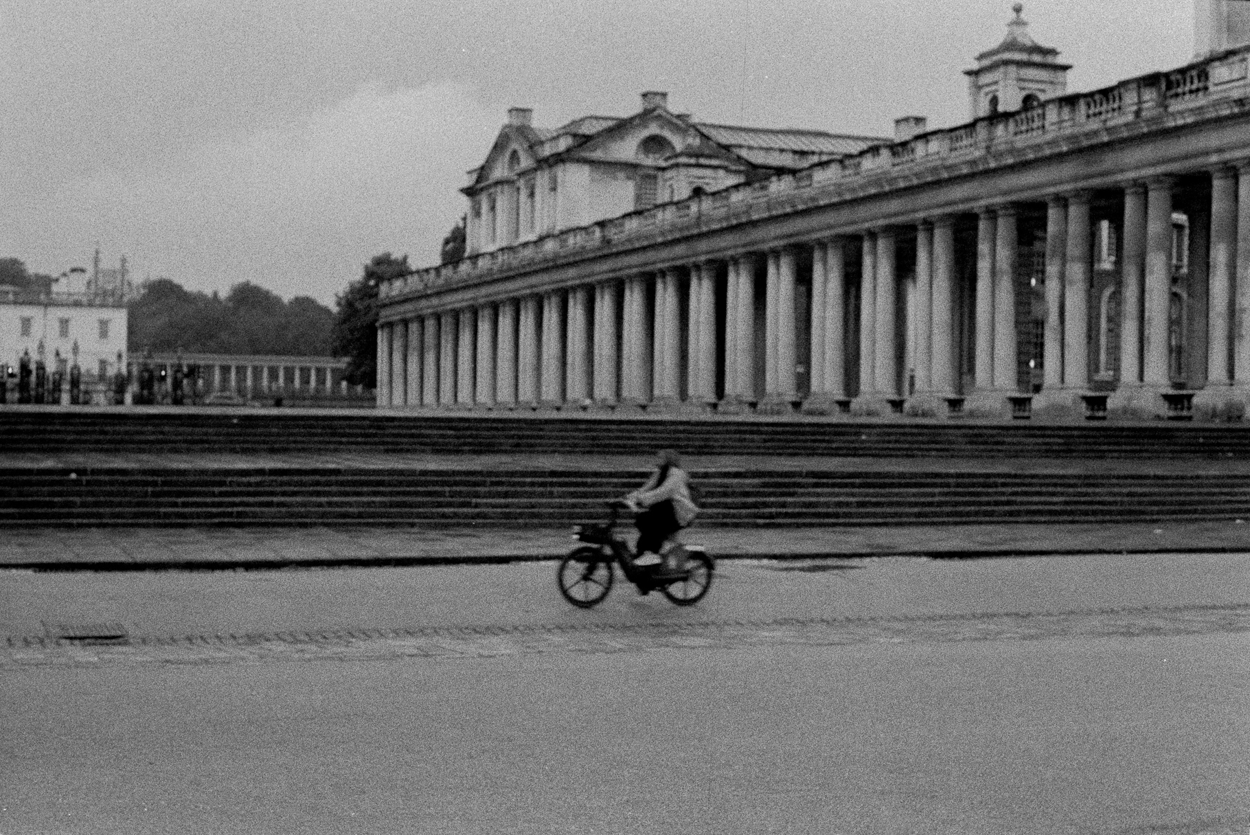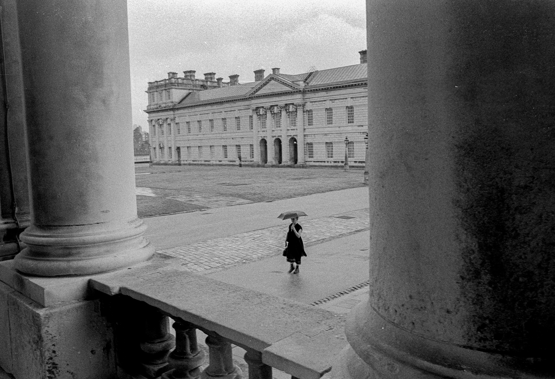 The wet morning worked in my favour - Greenwich largely empty, the usual Sunday crowds deterred by drizzle. I found myself drawn to solitary figures moving through these grand spaces: a cyclist crossing the Naval College courtyard, a woman with an umbrella navigating the cobblestones. These brief human moments against the backdrop of centuries-old architecture seemed to capture something essential about our relationship with time.