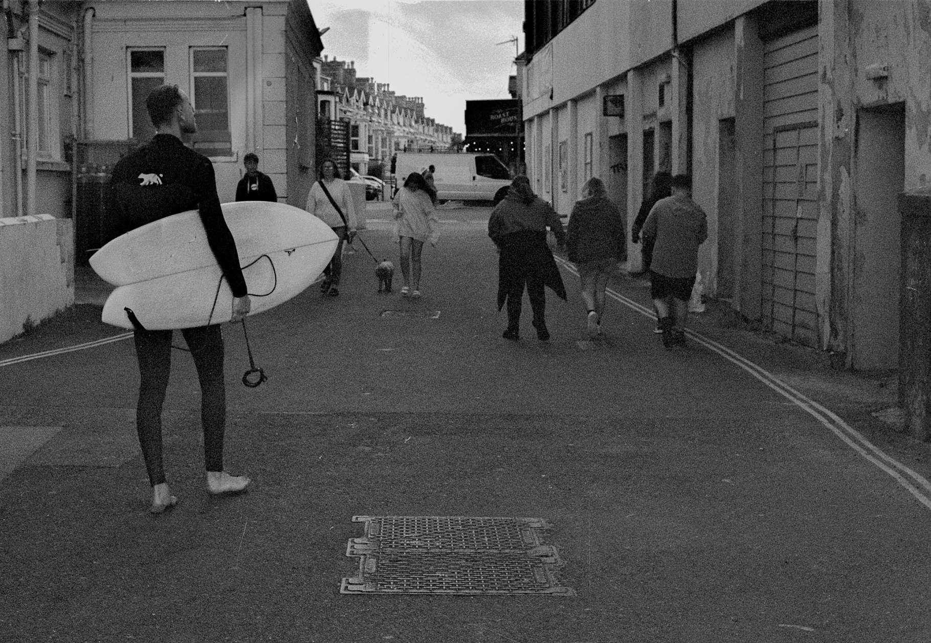 The guy walking along with a surfboard in what would otherwise be a pretty straightforward urban high street scene gives a good sense of how the surf culture in Newquay just blends into everyday life in the rest of town. The last picture below uses a couple in the far distance down on the beach as subjects to provide some depth to the image.